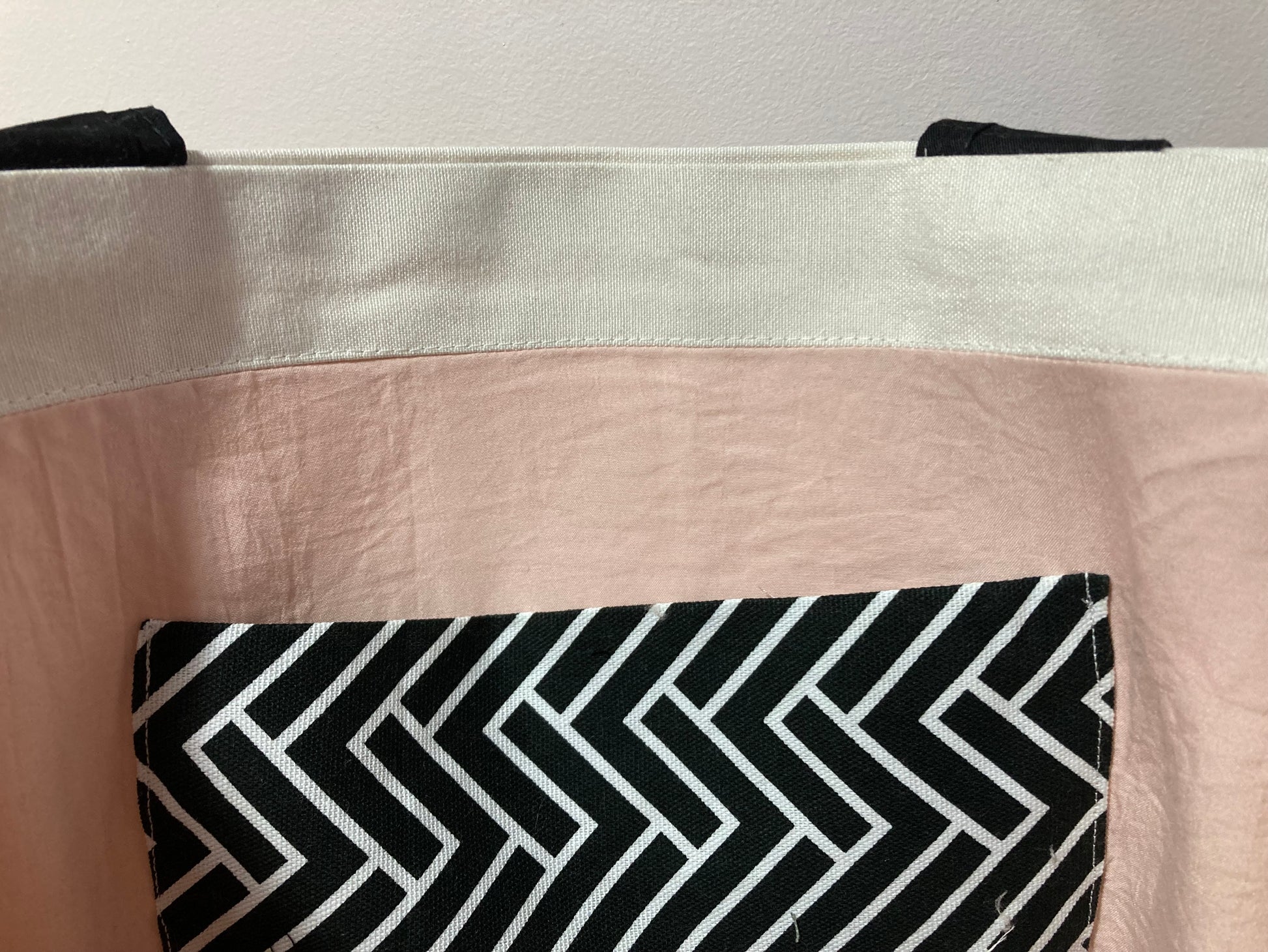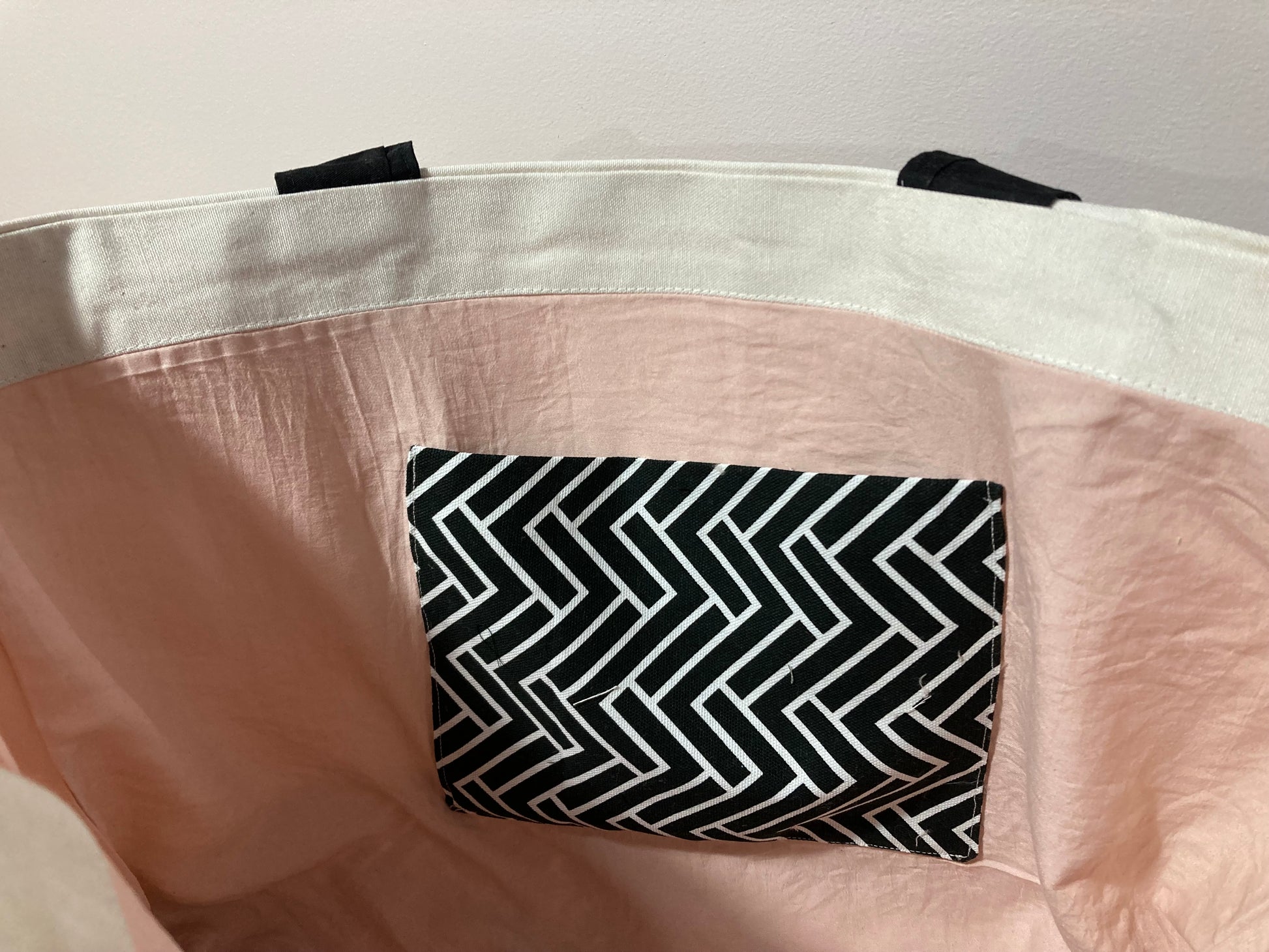 The Everyday Tote is a must-have for any stylish individual. With its unique black and white print bottom, off white linen exterior, and sturdy structure, this tote is perfect for everyday use. The interior features a beautiful dusty pink lining and a matching patch pocket, while boxed corners provide a flat base. Each bag is one of a kind, making it the perfect statement piece.